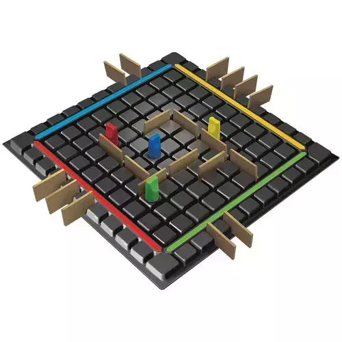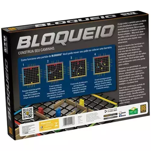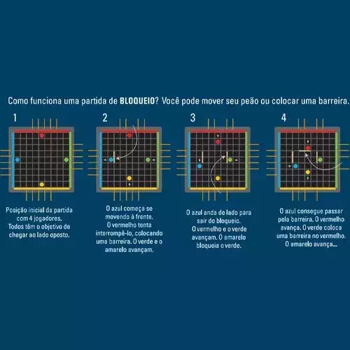 Componentes : | 1 tabuleiro 4 peões 8 etiquetas 20 placas de MDF (Barreiras) 1 saco plástico 1 manual de instruções |