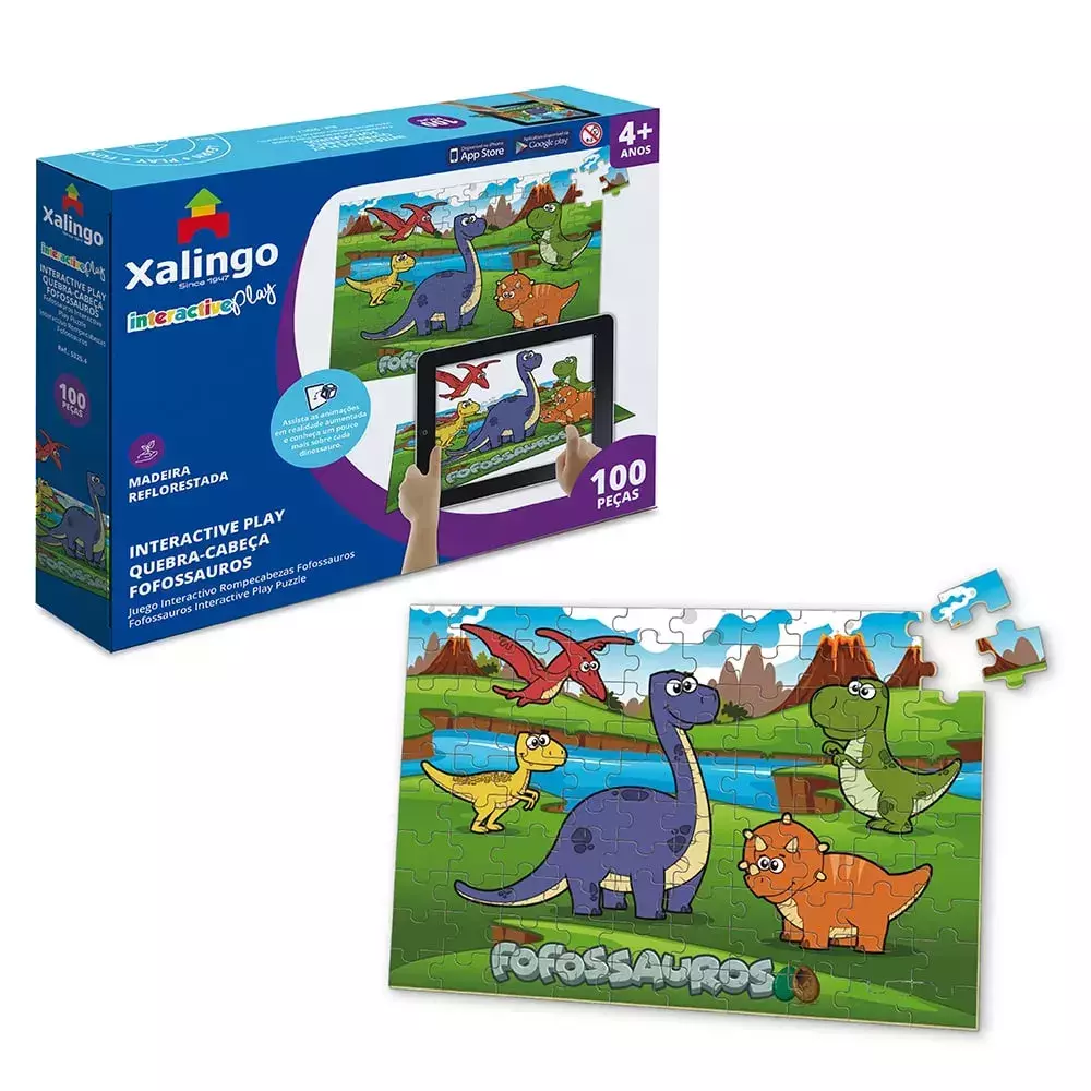 Aprender e se divertir ao mesmo nunca foi tão divertido com o Quebra-cabeça Interactive Play Fofossauros! A Xalingo Brinquedos traz para o mercado em primeira mão, a linha de jogos Interactive Play, unindo em um mesmo produto a brincadeira física e a realidade aumentada, proporcionando para a criança uma experiência ampliada de aprendizado. Depois de montar o quebra-cabeça de 100 peças em madeira, a criança poderá captar as imagens através do App e aprender sobre os dinossauros, com muita diversão! O jogo desenvolve a atenção, a discriminação visual, o pensamento lógico e a relação parte e todo. Ideal para crianças a partir dos 4 anos. Garanta já e dê um presente divertido e educativo para os pequenos!